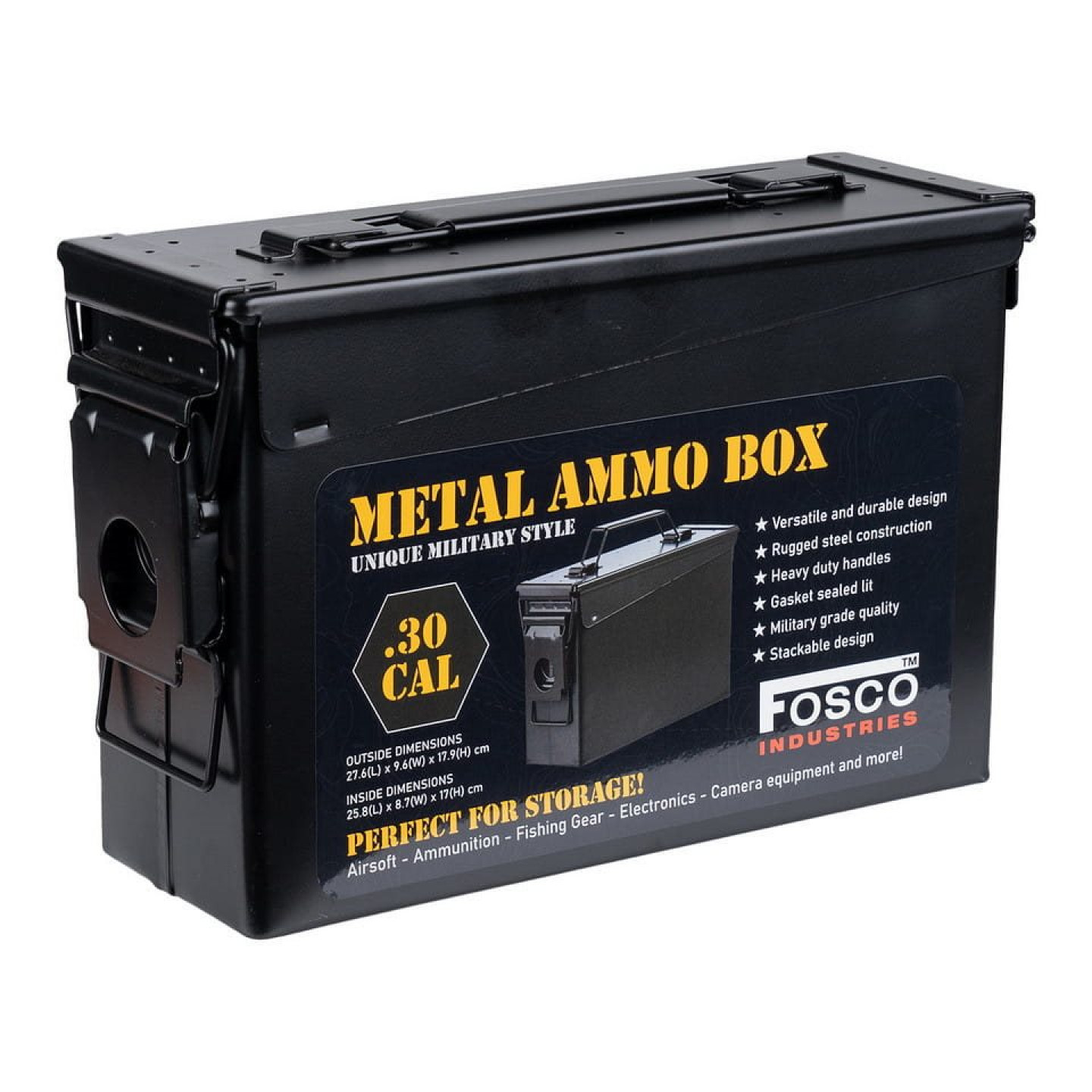 Muničná debna s potlačou. Oceľová konštrukcia. Rozmery 27,6 x 9,6 x 17,9 cm.