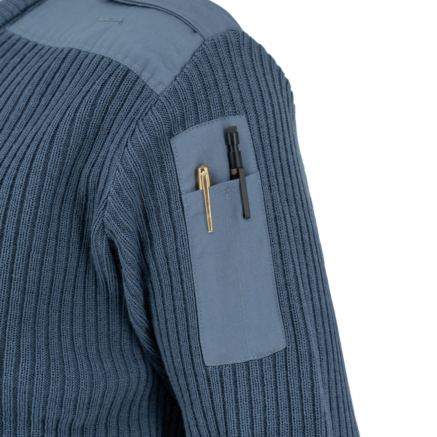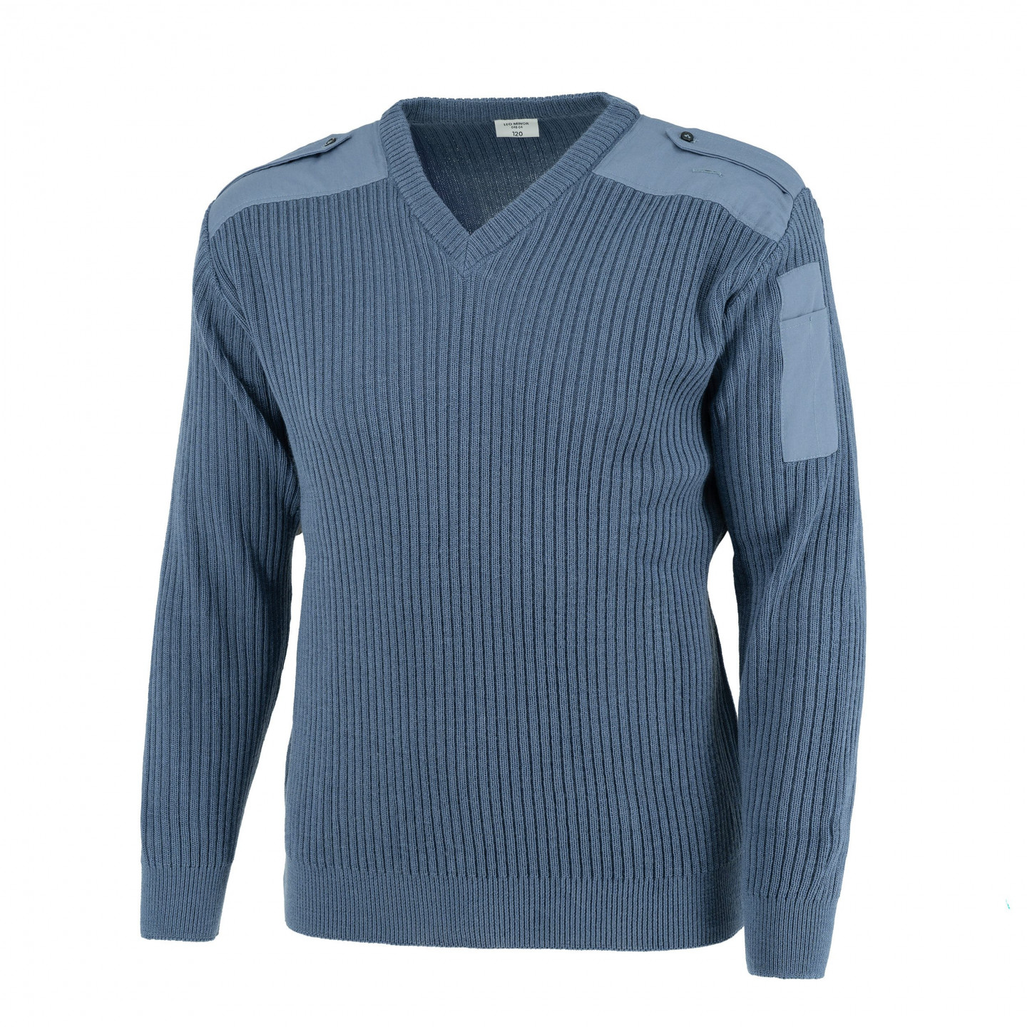 Vlnený sveter s výstrihom do V z francúzskej armády. Vystužené ramená a lakte. Náramenníky. Na ľavom rukáve vrecko na písacie potreby. Materiál: 100% vlna. Výrobca Leo Minor.