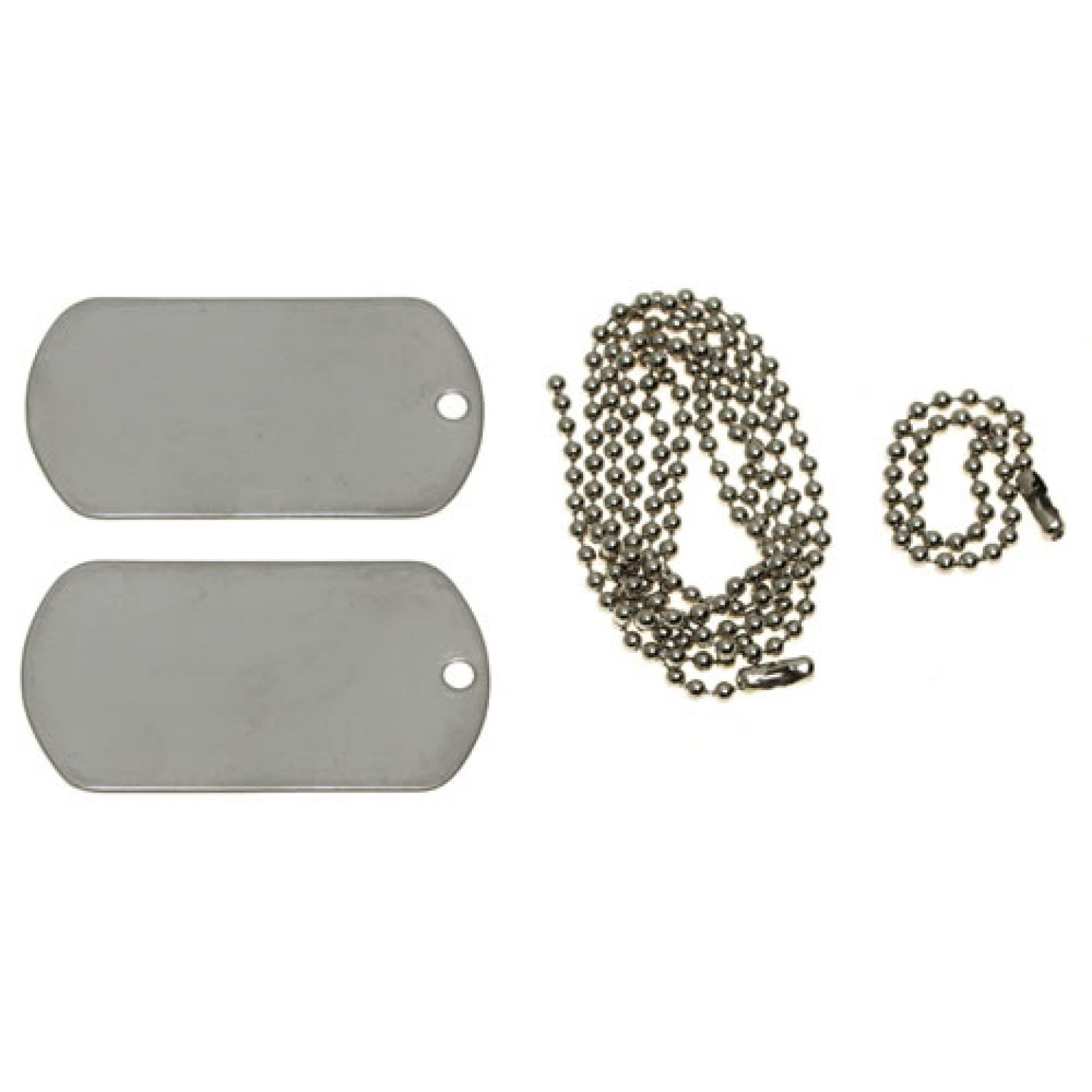 Sada identifikačných známok (dog tags), vrátane retiazky. Obsahuje dva pliešky z nehrdzavejúcej ocele a dve retiazky poniklované /jedna dlhá a jedna krátka/.